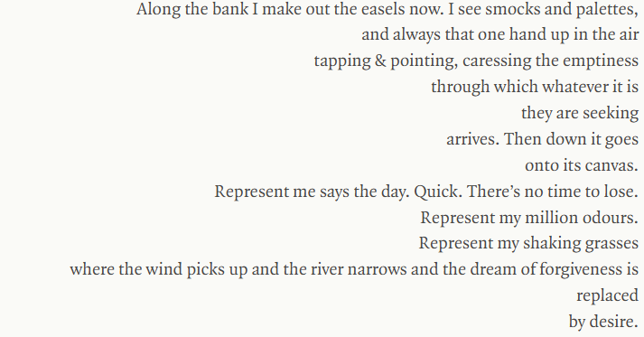 The syntax of these marvellous lines mimics the gesture they describe, the words pointing and caressing an emptiness until whatever it is/ they are seeking is brought into material being by the poem. The subject of this complex clause begins located in “that one hand,” then shifts to the painters themselves, (“they are seeking”) and finally moves to the emerging “whatever it is,” which arrives, enjambed, over the next line, to be brought into art work.